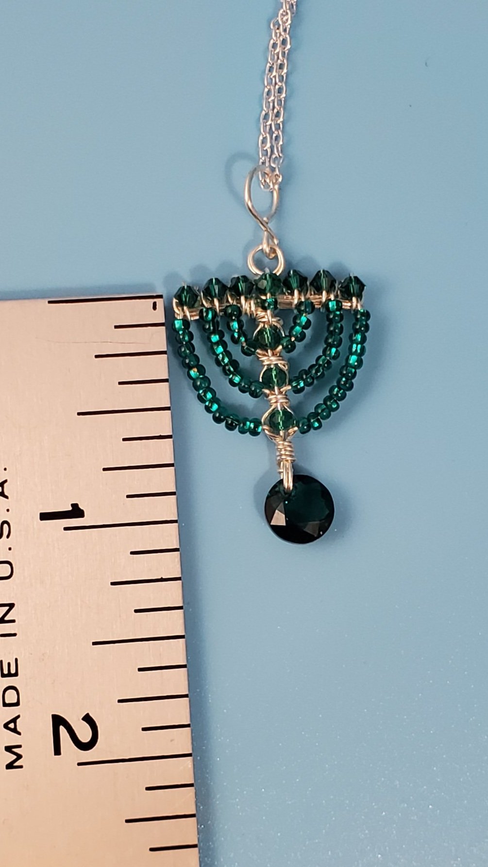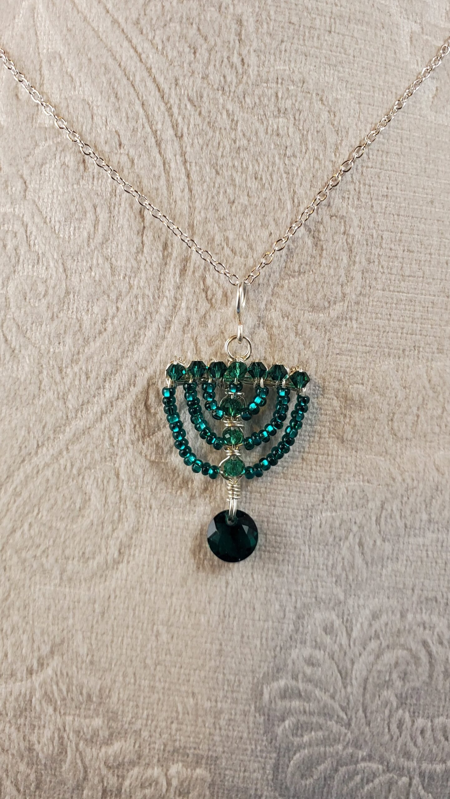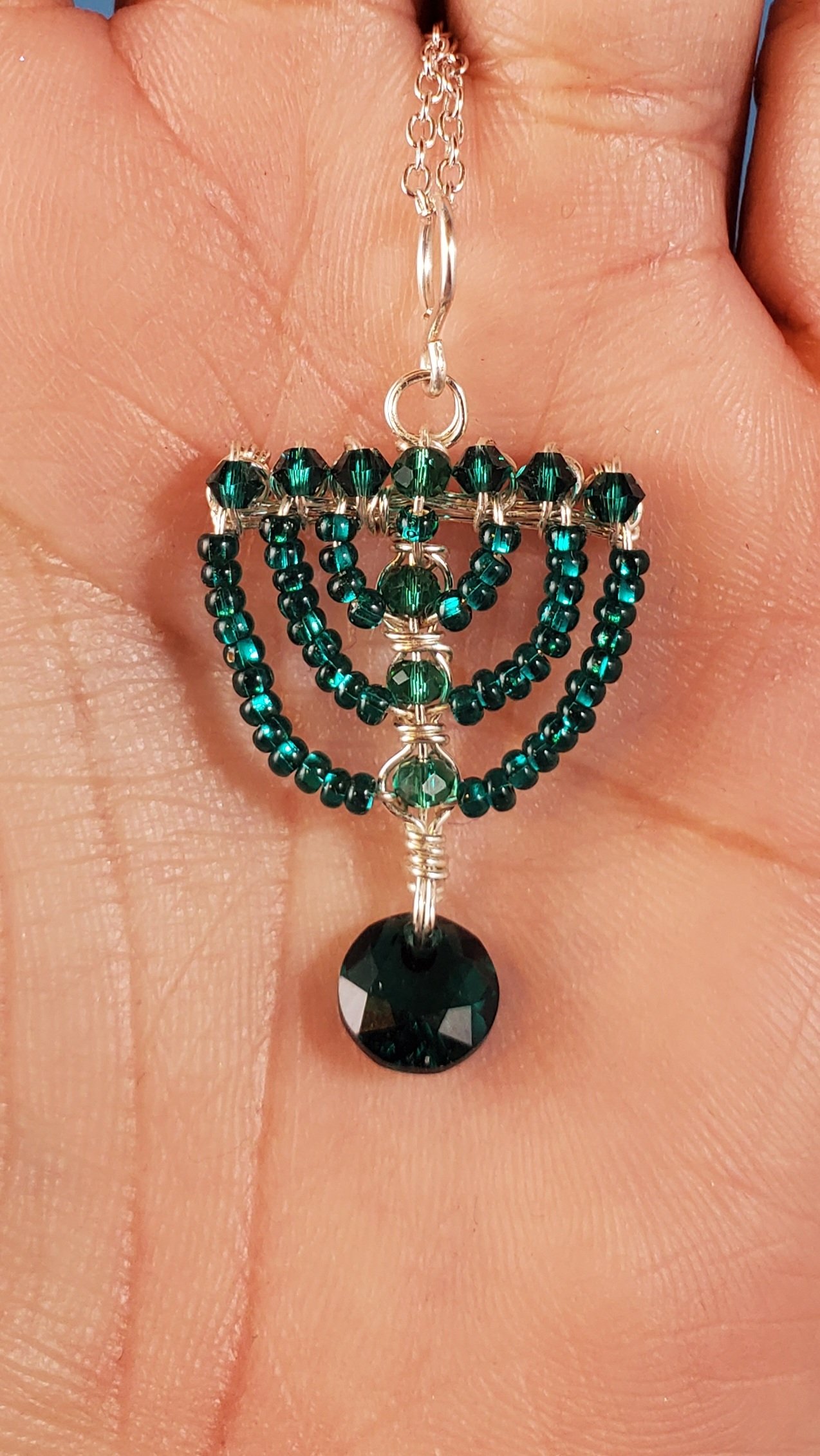 This angelic Humility Menorah is a masterpiece of meticulous craftsmanship. Intricately woven from silver-coated copper wire, it is illuminated by the rich glow of genuine Emerald Swarovski crystals and delicate emerald seed beads. A divine center-piece for any home