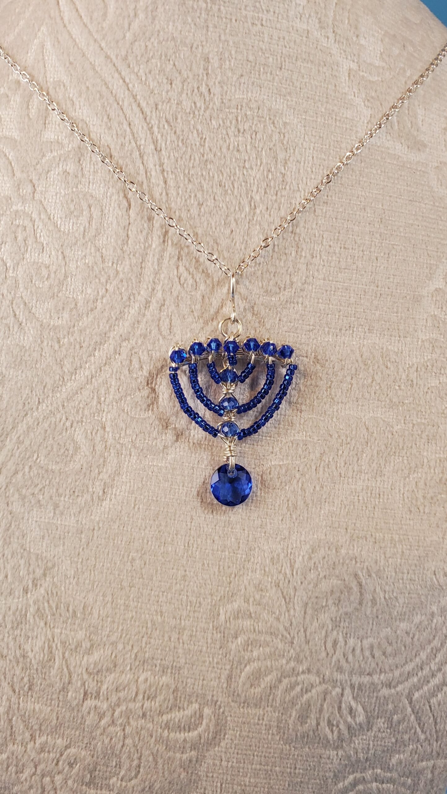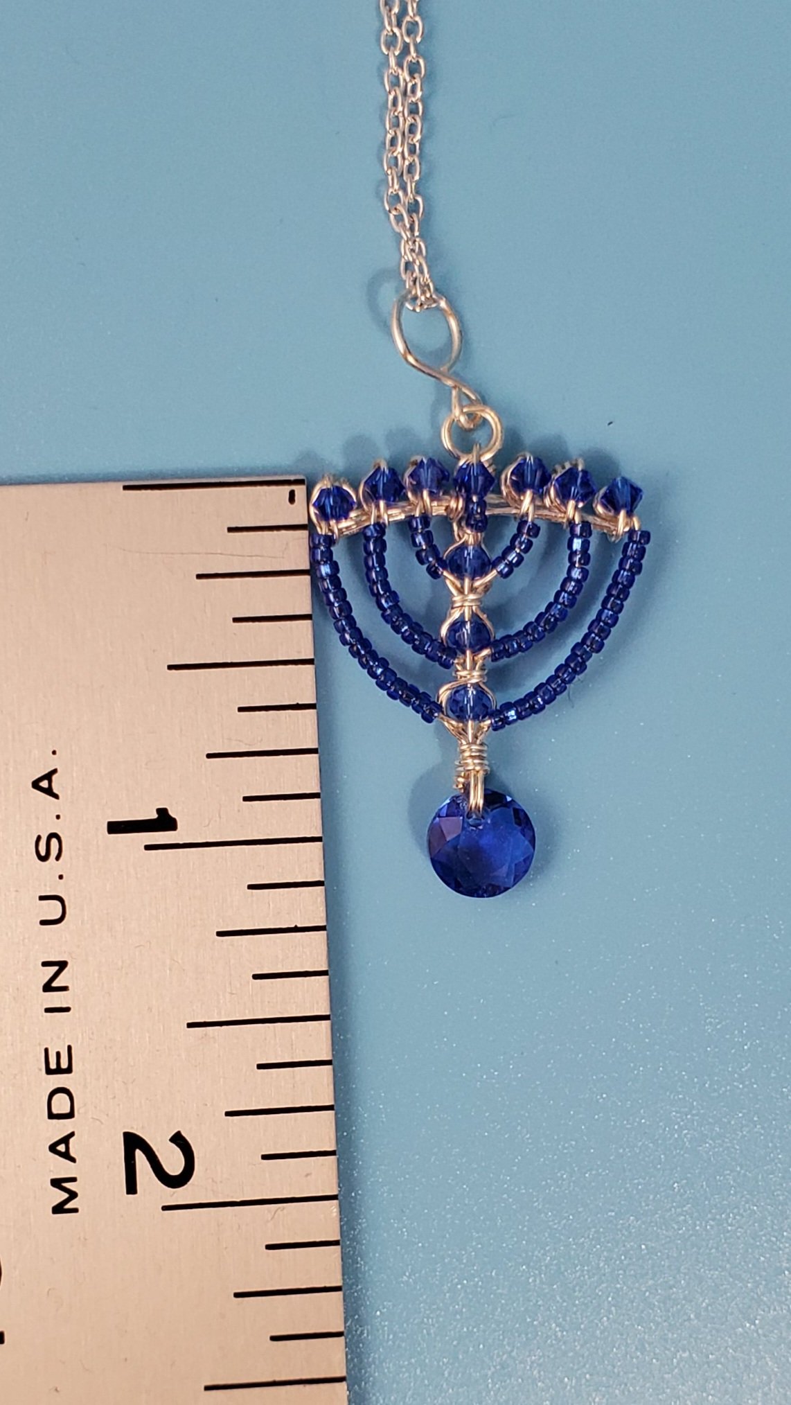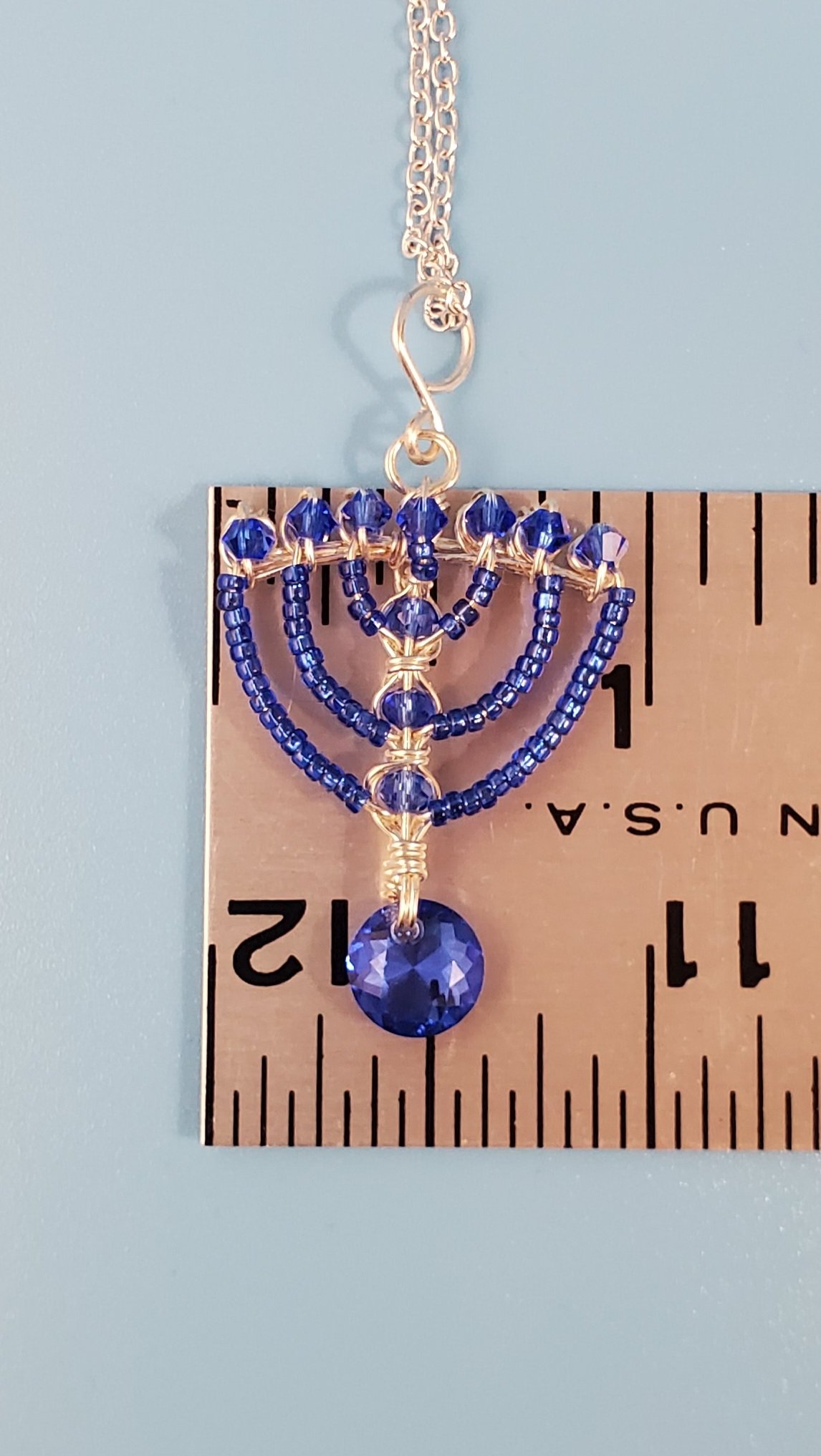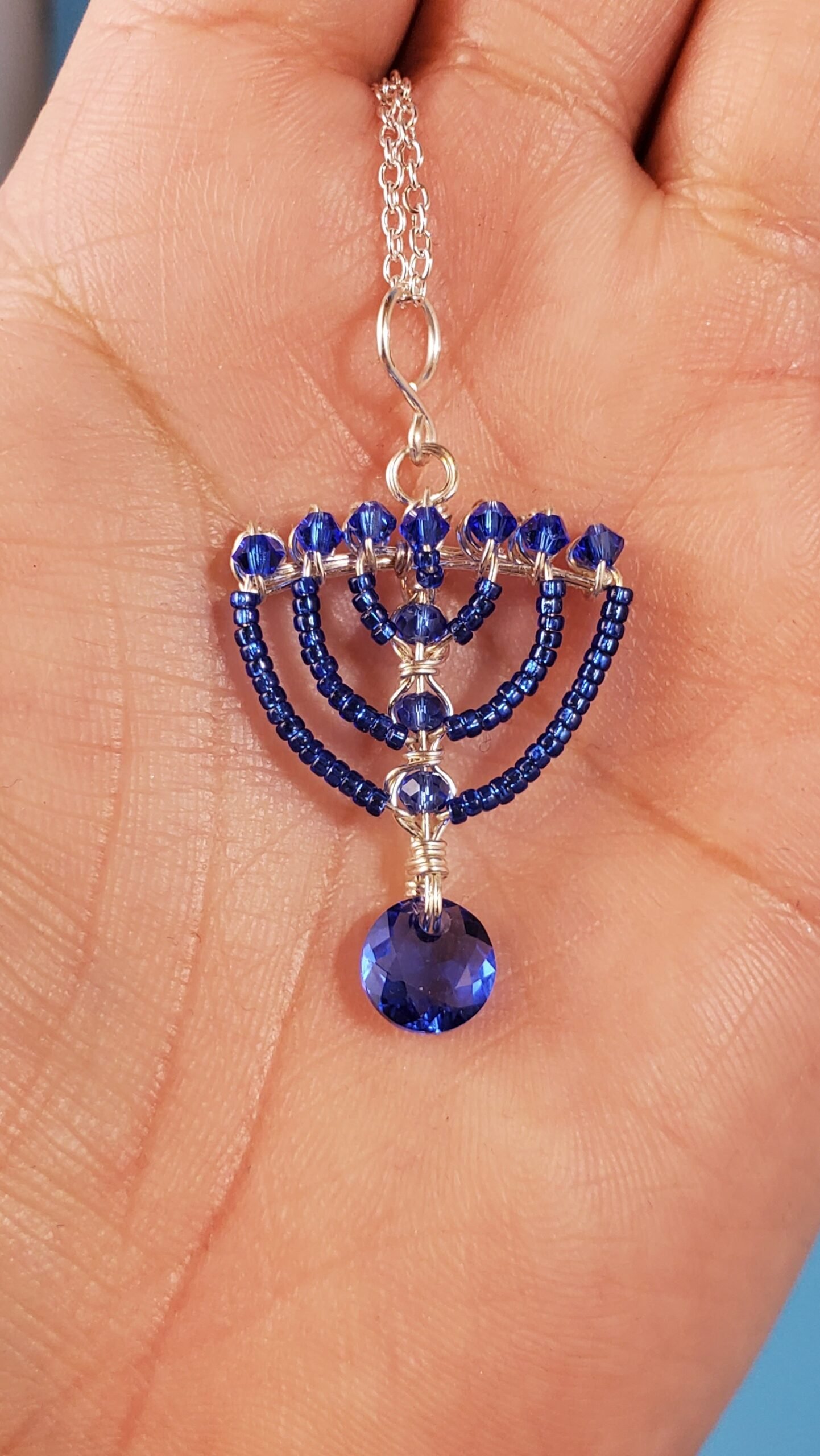 Discover the elegant Justice Menorah Pendant, a handcrafted statement piece designed for faith-inspired style. This unique menorah necklace is carefully made with silver-coated copper wire and beautifully accented with genuine Swarovski crystals and rich royal blue glass seed beads.