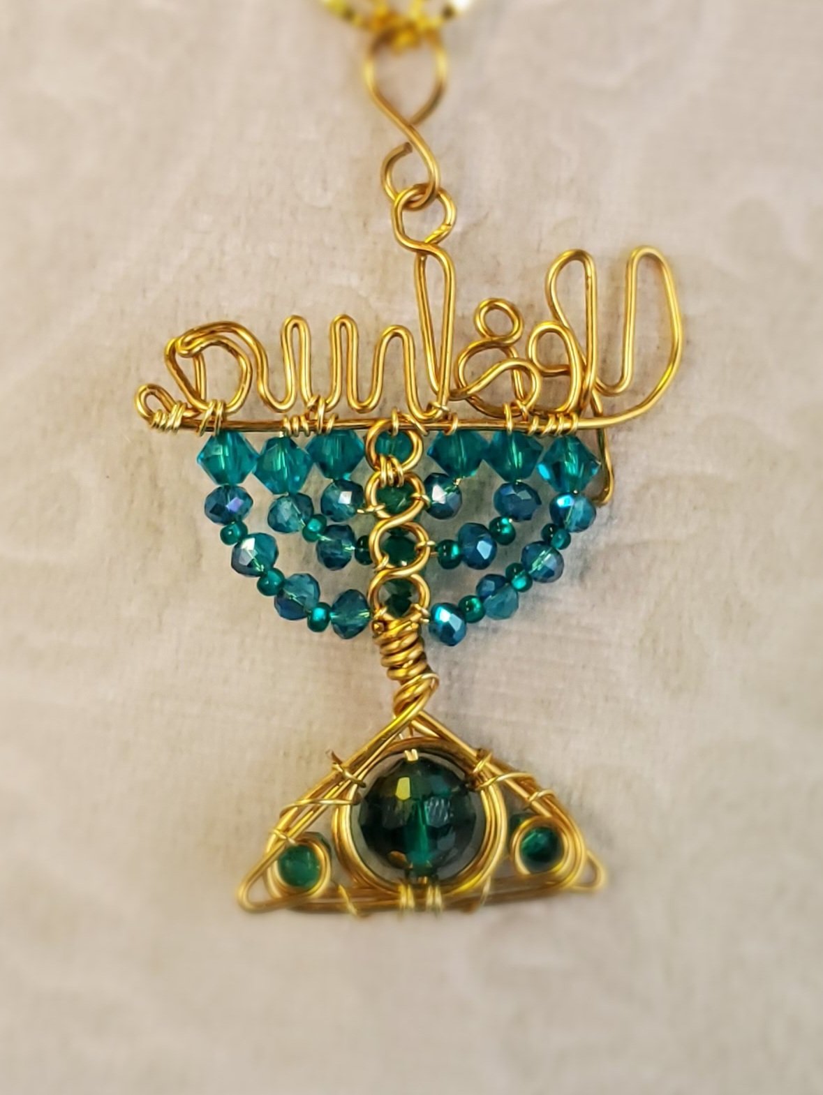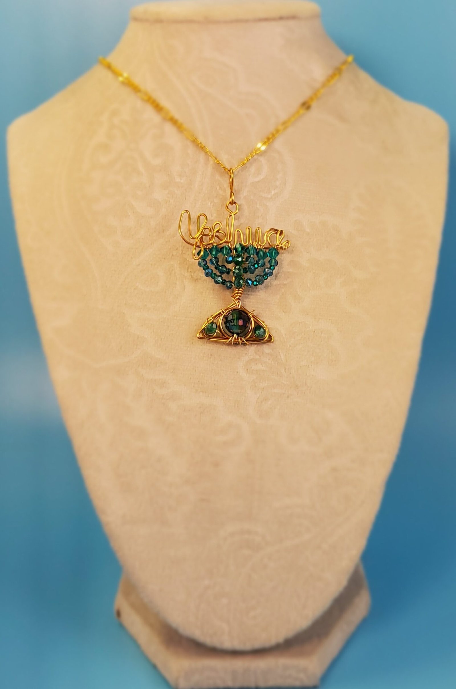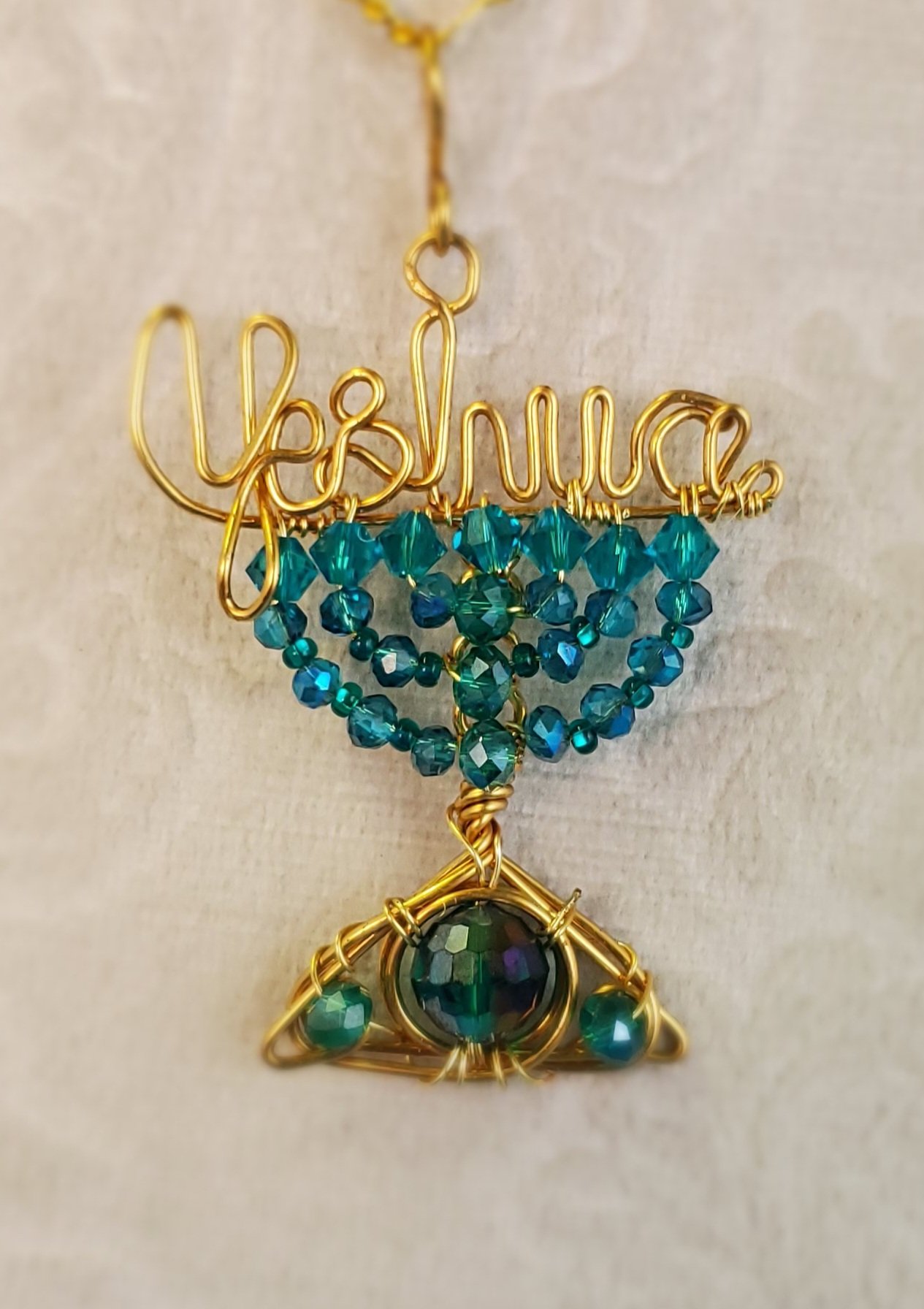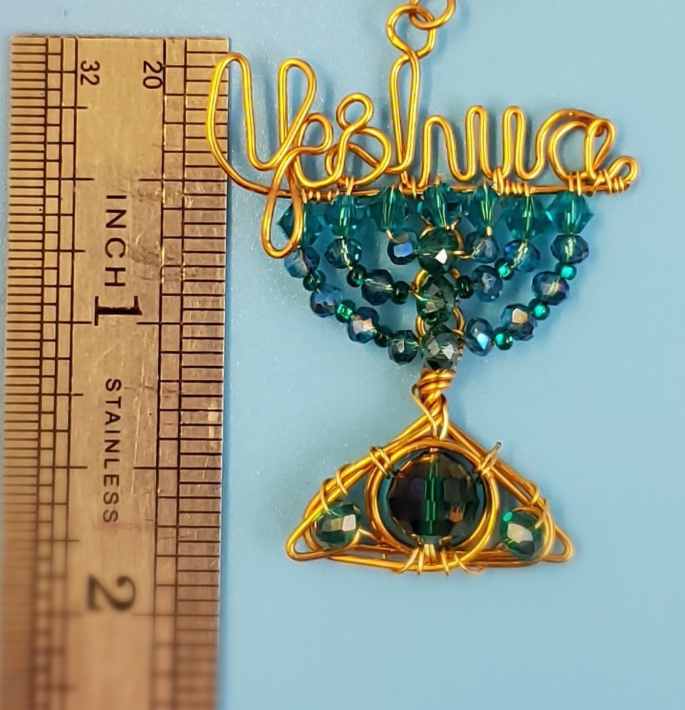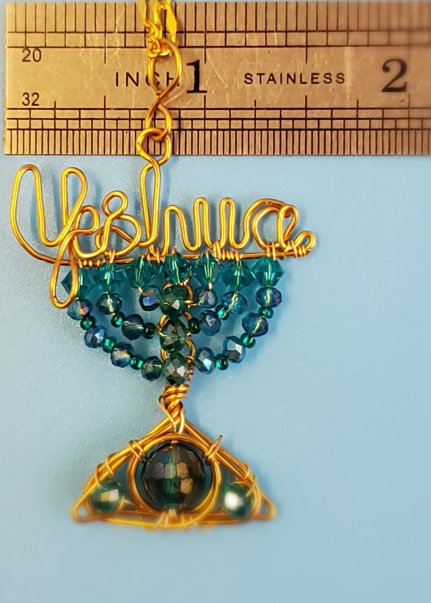 This Ocean Color Inspiration Yeshua Menorah Pendant is handcrafted with Swarovski Xilion Bicone crystal beads and glass beads of different sizes. It is wrapped in to a menorah with 20g brass wire.