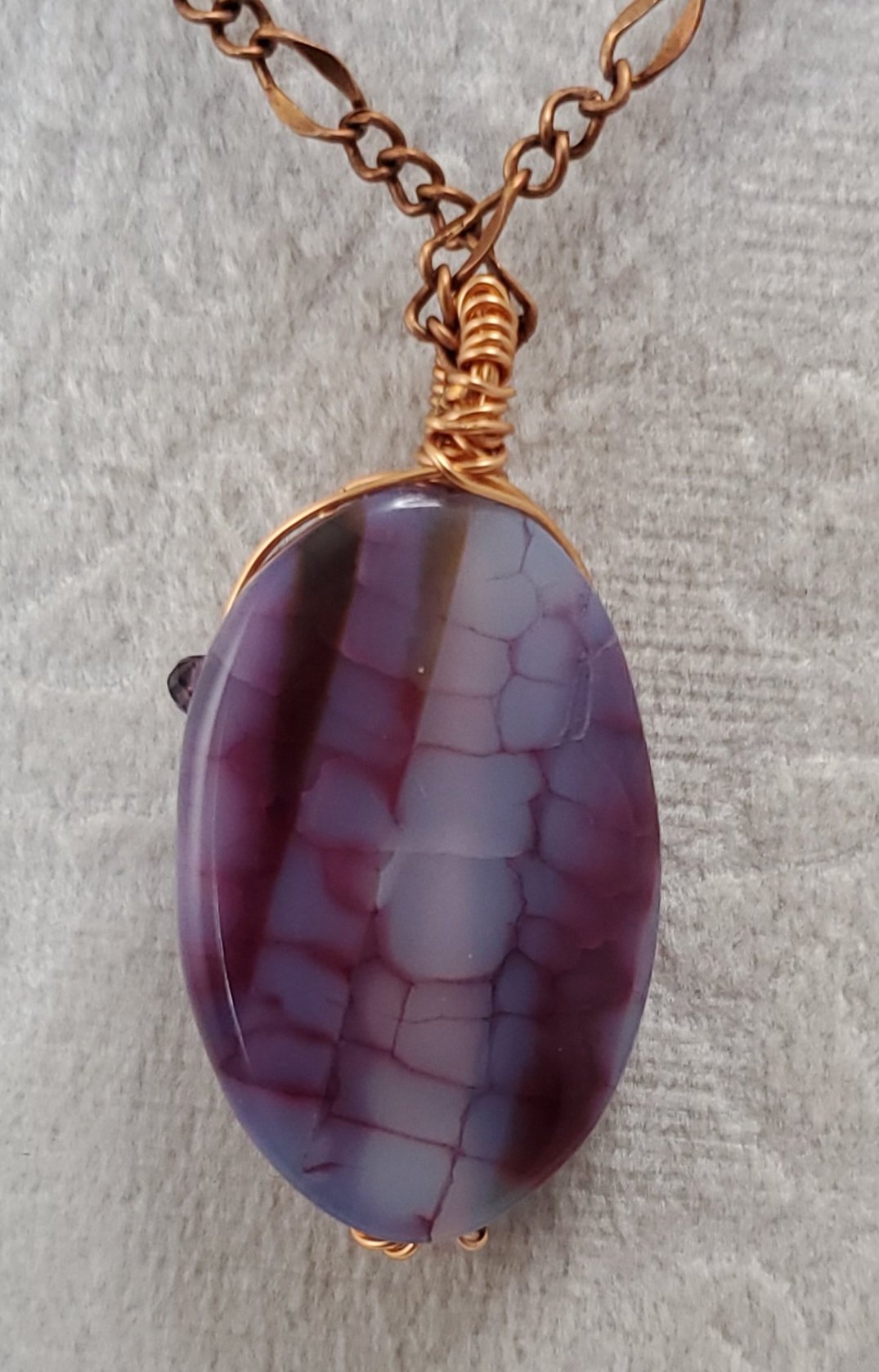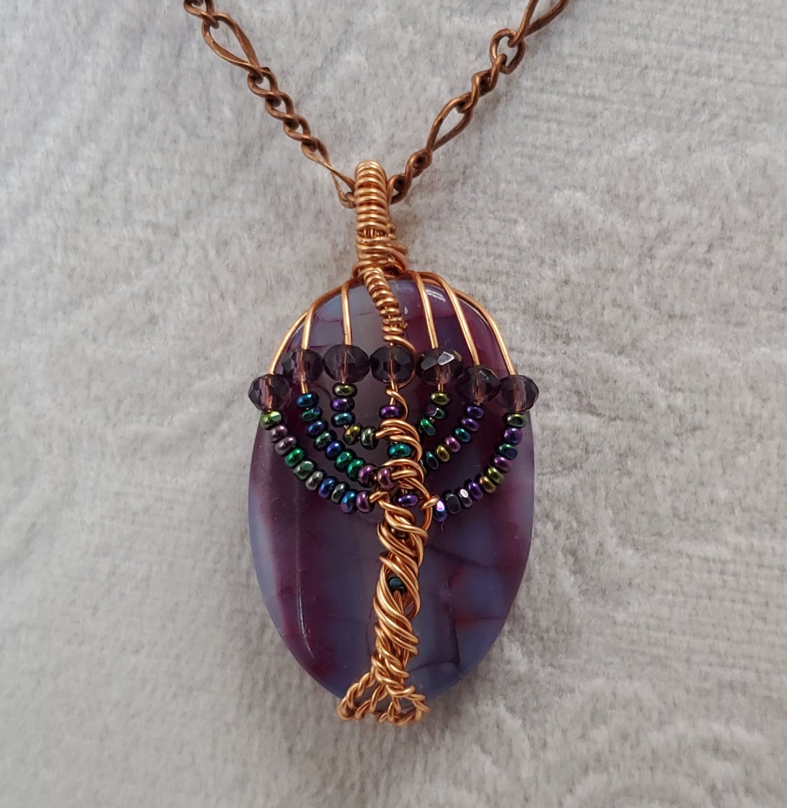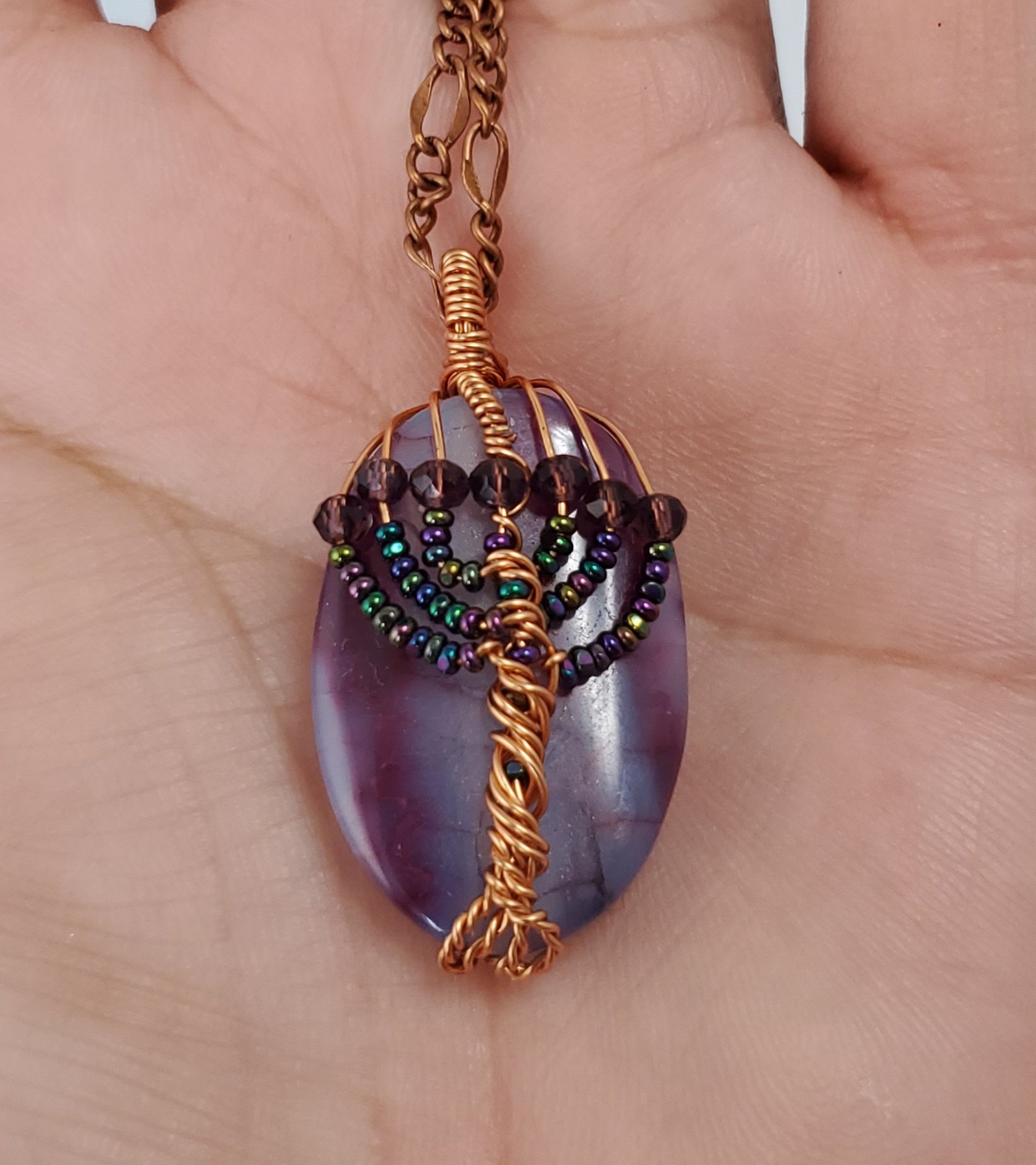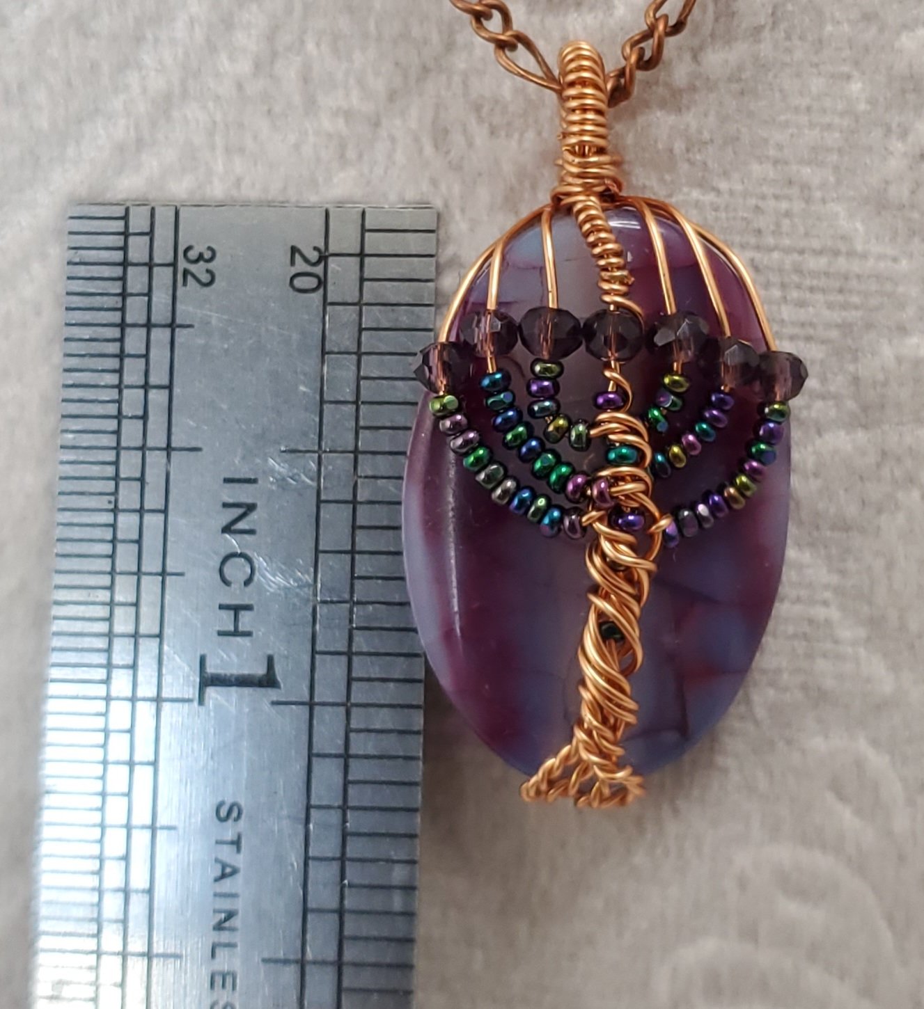This stunning Menorah Stone Pendant is handcrafted with a agate purple stone with copper wire and purple seed glass beads